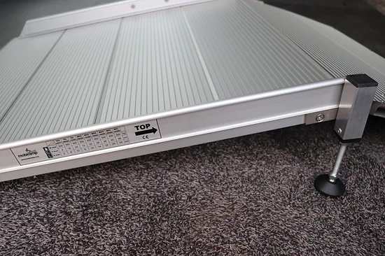 Uiteraard is de drempelbrug voorzien van een anti-slip oppervlak en gaten voor een snelle afvoer van regenwater. De drempelbrug is uitgevoerd met 2 beweegbare anti-slip voeten zodat deze altijd stabiel blijft liggen. Door de traploos verstelbare poten is de drempelbrug voor iedere gewenste hoogte precies instelbaar. De zijkanten zijn voorzien van een afrijbeveiliging.
